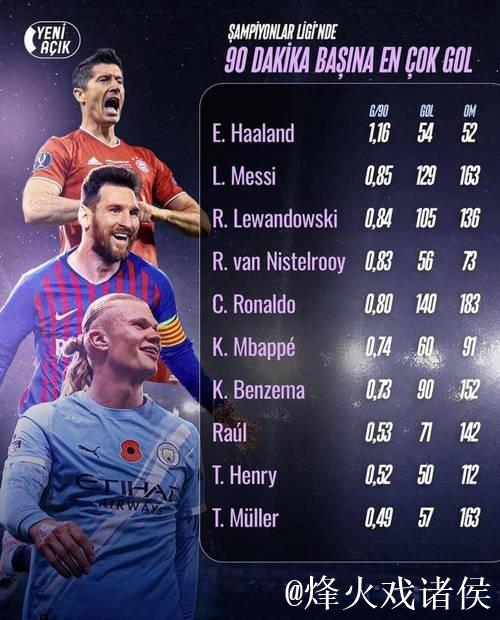 在本赛季最新出炉的一项欧冠数据统计中,曼城前锋埃尔林·哈兰德再度刷新人们对“高效射手”的认知:在欧冠联赛历史每90分钟进球效率榜上,哈兰德以惊人的数据力压“欧冠之王”克里斯蒂亚诺·罗纳尔多,位居历史第